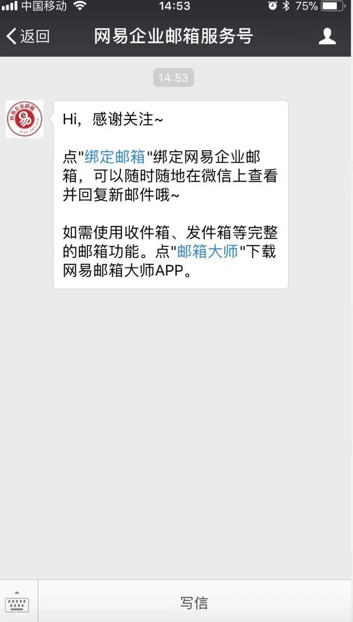 您只需关注“网易企业邮箱服务号”并绑定企业邮箱帐号,即可在微信中享受收信提醒、预览邮件及其附件、快速回复/转发邮件、快捷写信的服务。